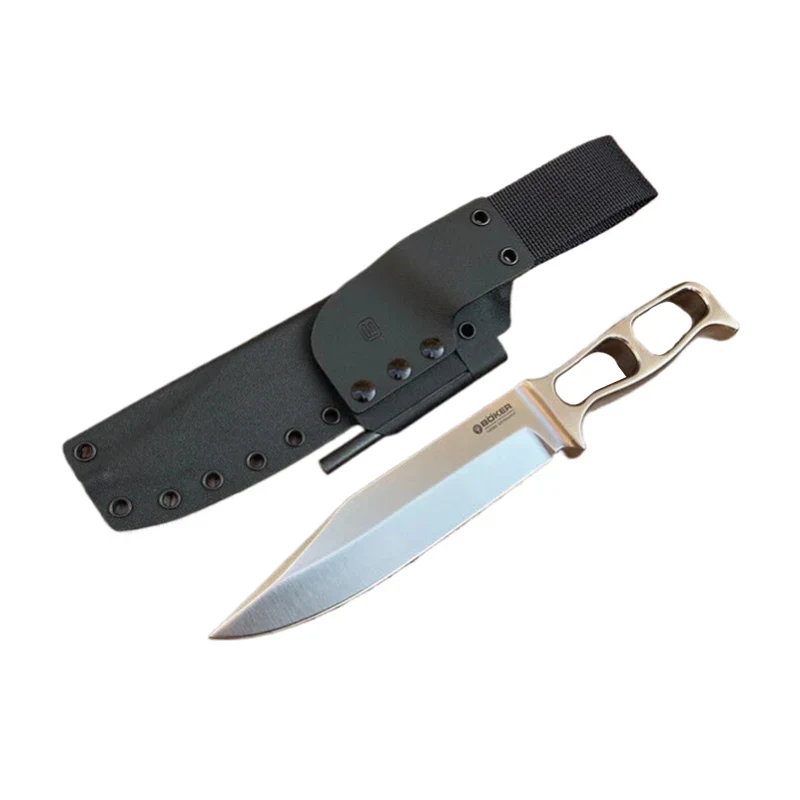 Kydexové pouzdro je vyrobeno extra štíhle a má na špičce dostatečně velký drenážní otvor, aby bylo možné vypláchnout nečistoty a vlasy. Otvor pouzdra byl tvarován tak, aby nůž bezpečně seděl a stále jej lze vytáhnout jednou rukou bez většího odporu. Vzhledem k velikosti a váze kempingového nože doporučuji držák na opasek s nylonovými popruhy. Dáváte-li přednost Multi-Lok, lze jej díky uspořádání oček připevnit vodorovně, svisle i diagonálně - takže máte všechny možnosti nošení otevřené.